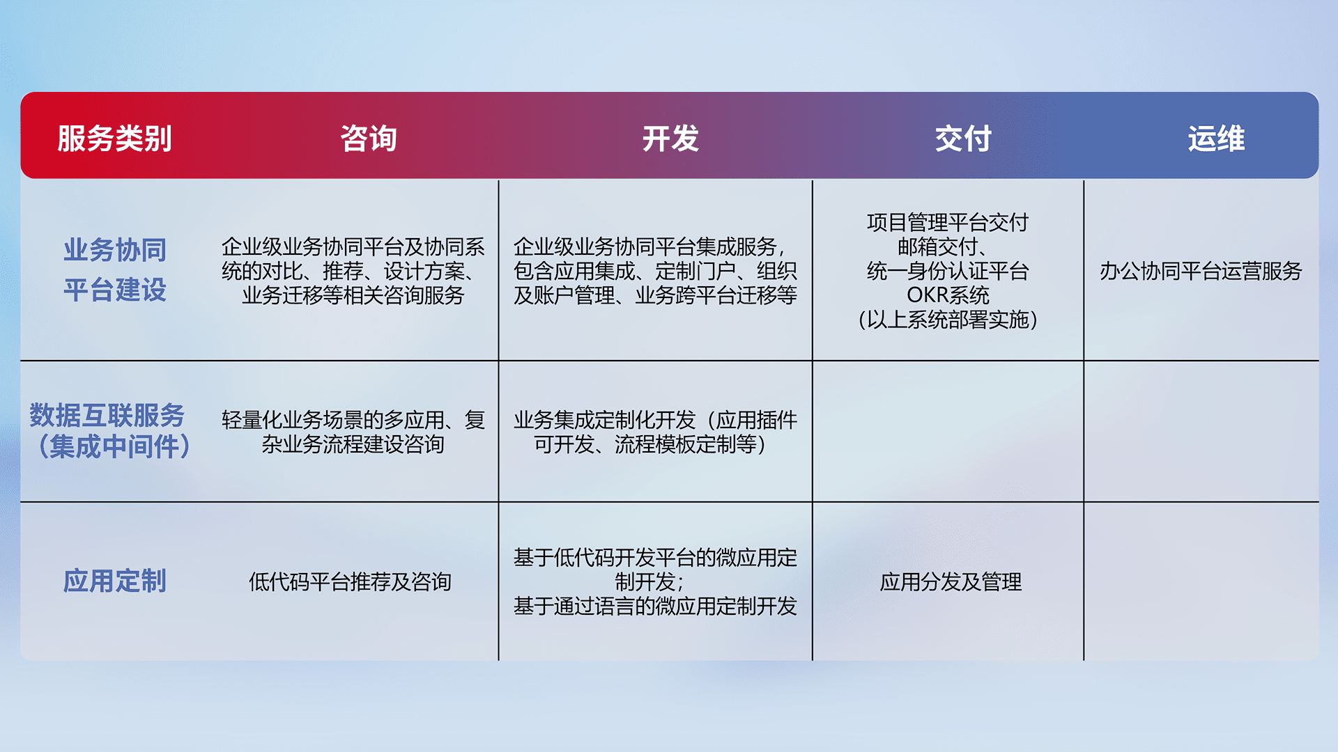 针对钉钉、、、、企微、、、、IDaas等平台级产品提供产品的规划、、、方案、、、、交付、、定制化开发等服务,,,实现如统一协同办公、、、智能客户服务、、、、混合会议管理、、、、智能数据查询、、、等业务场景,,,,实现数字化转型。。